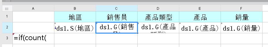 設計表格,將對應欄位拖入到儲存格中,設定地區所在 A2 儲存格的資料設定為「列表」,如下圖所示: