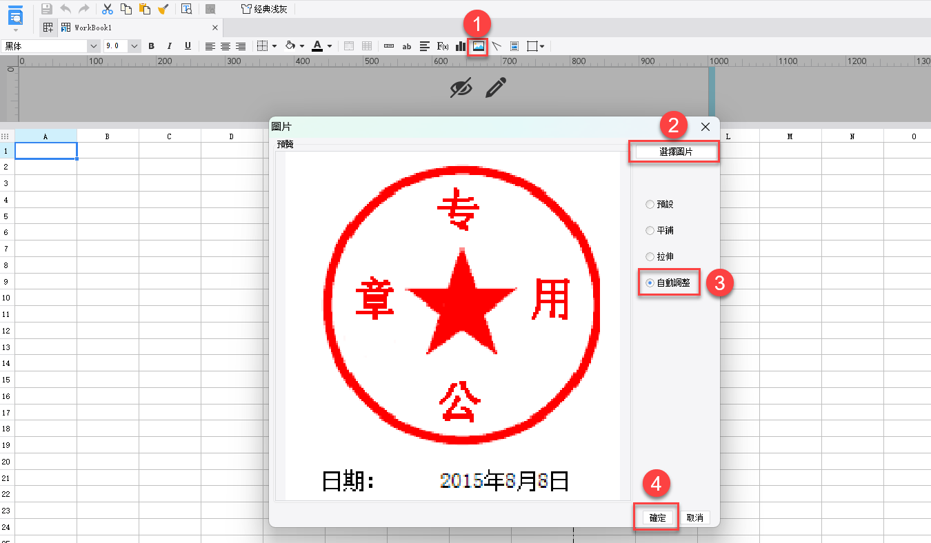 選中儲存格,按工具欄的插入圖片按鈕,選擇圖片後,選擇適應選項,圖片將對於儲存格進行自動調整,如下圖: