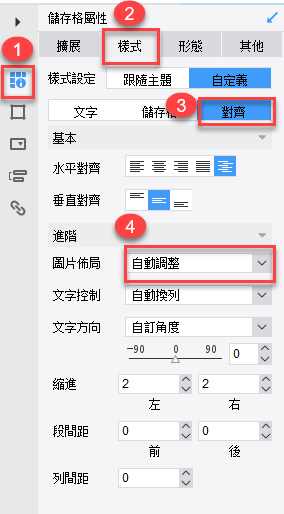在報表右側的儲存格屬性面板中選擇「樣式>自定義>對齊」,將圖片佈局的方式改為自動調整,如下圖: