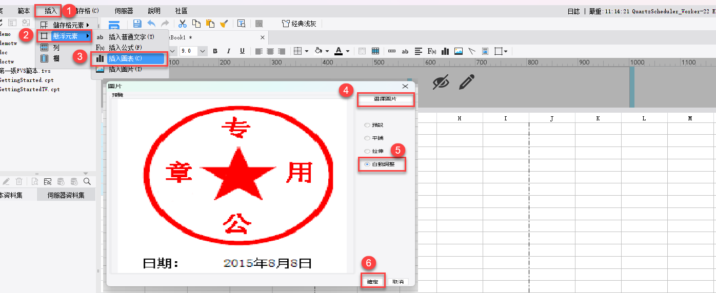 例如,電子簽章圖片在 FineReport 安裝目錄的 webroot 資料夾下,名稱為 gongzhang.png,設定儲存格內容為: