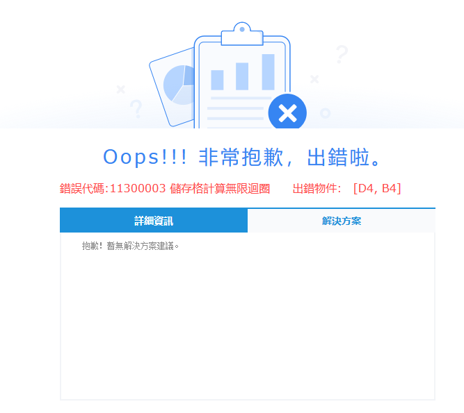 或在做範本程式中,日誌出現報錯提示:ERROR [standard] 錯誤代碼:11300003 儲存格計算無限迴圈 出錯物件: [D4,B4]