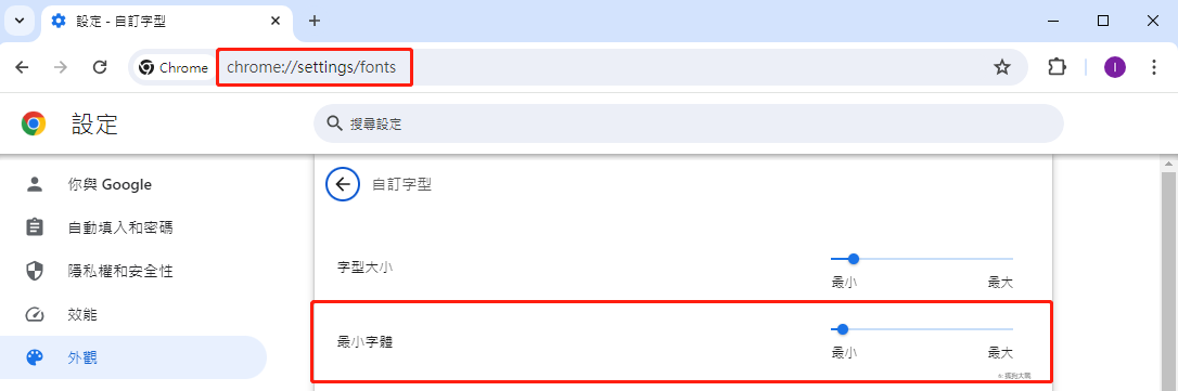 瀏覽器預覽介面:支援自訂字體最小字號,設定路徑為 chrome://settings/fonts 。如下圖所示: