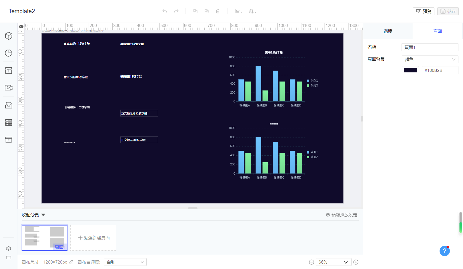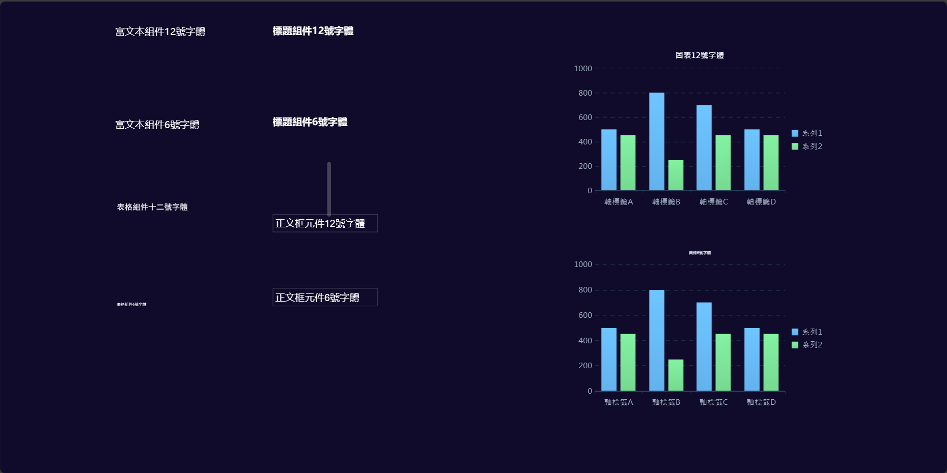 所有圖表組件和表格組件,不受最小字號限制,可按照實際字號顯示;其餘組件設定字號小於最小字號時,按最小字號顯示。