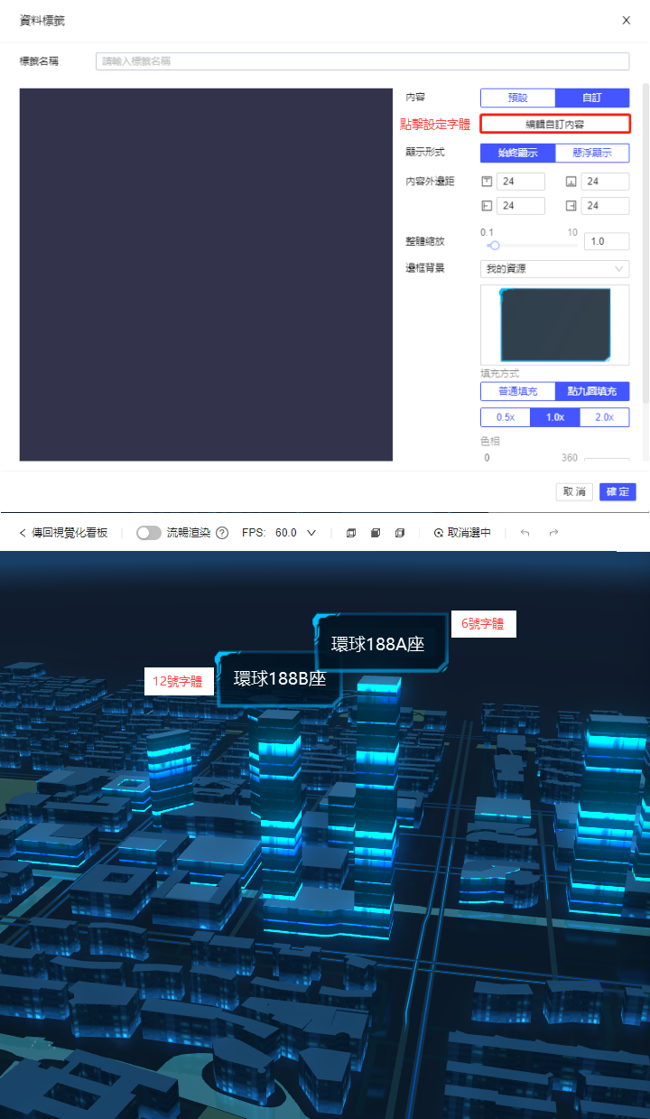 三維組件標籤同樣受最小字號限制,12 號字體和 6 號字體顯示的大小一致。如下圖所示: