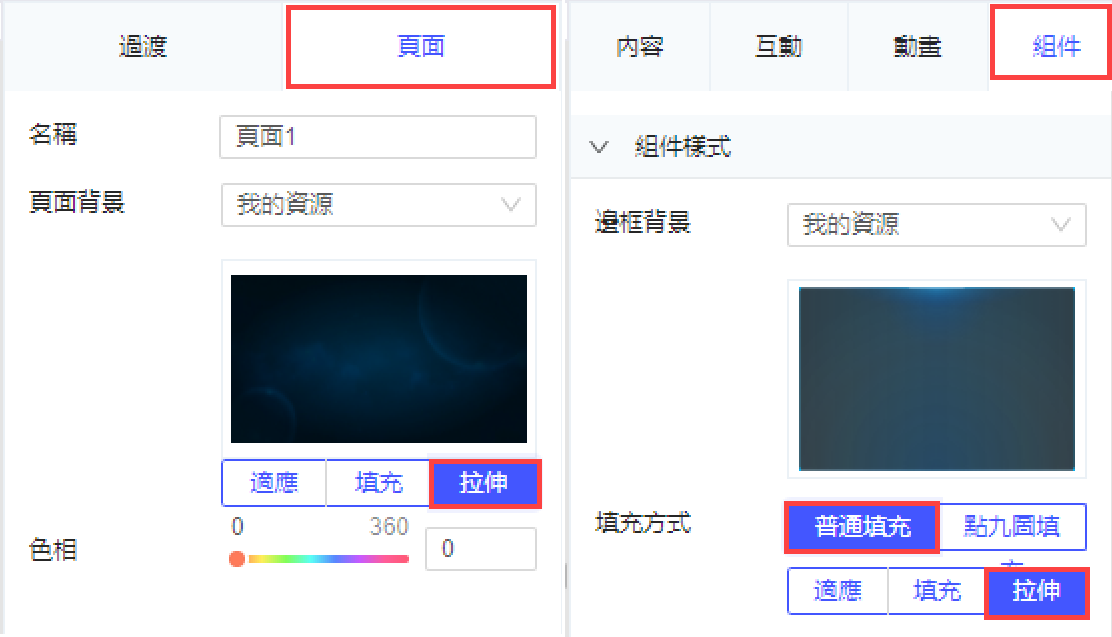 注:雙向鋪滿時,範本頁面/組件背景在雙向鋪滿下可能會顯示錯位,建議將範本頁面/組件的背景填充方式調整為「拉伸」。如下圖所示:
