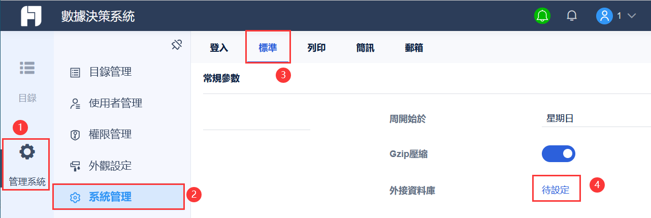 管理者登入數據決策系統,點選「管理系統>系統管理>標準」。