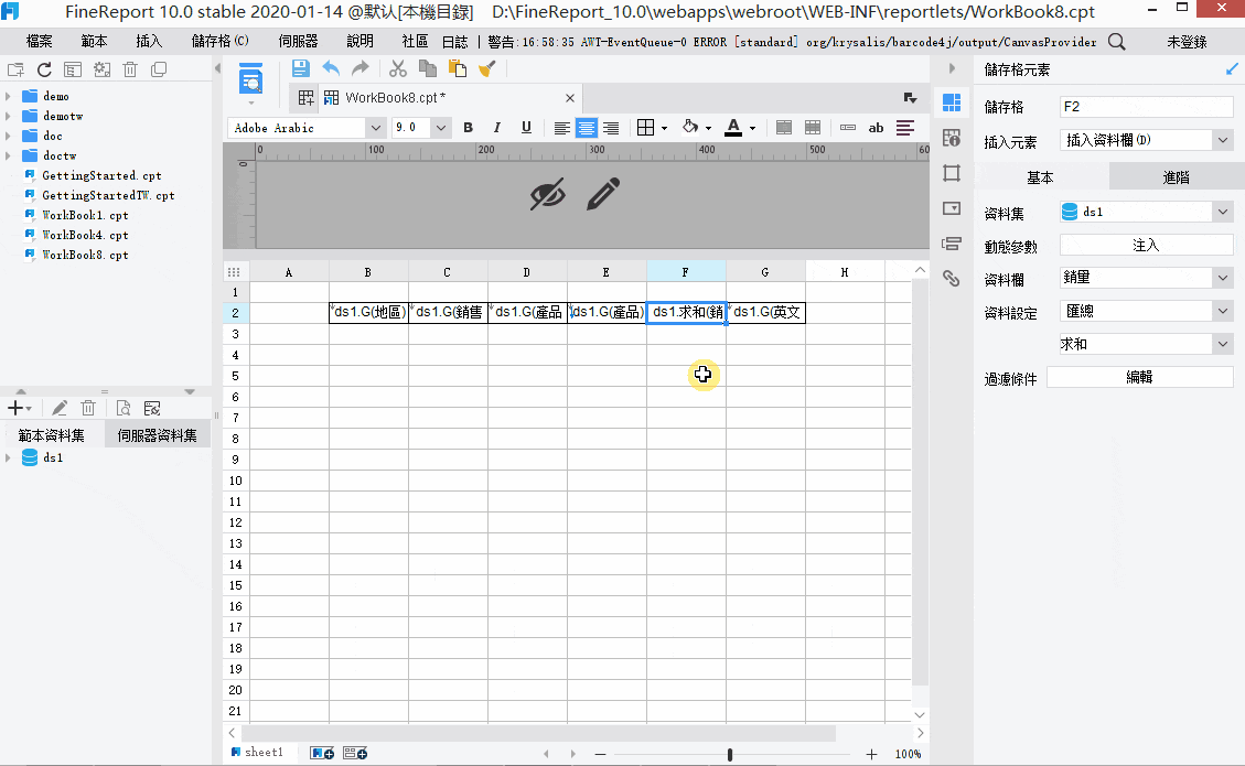 如【F2】儲存格裡的ds1.求和,【求和】這個文字,表示資料欄設定為【匯總】,這就是Excel中的SUM()公式。