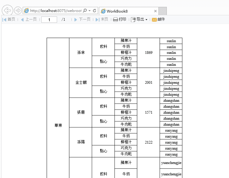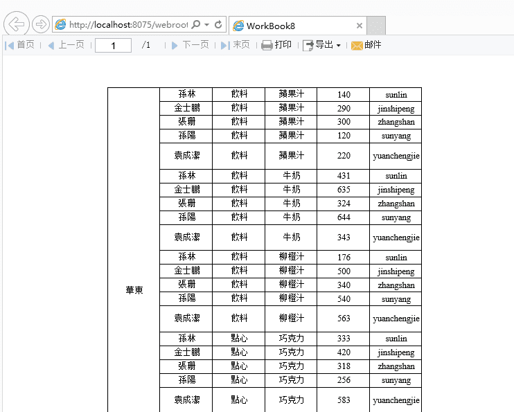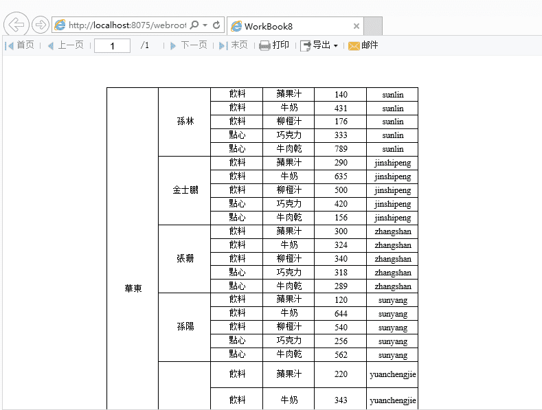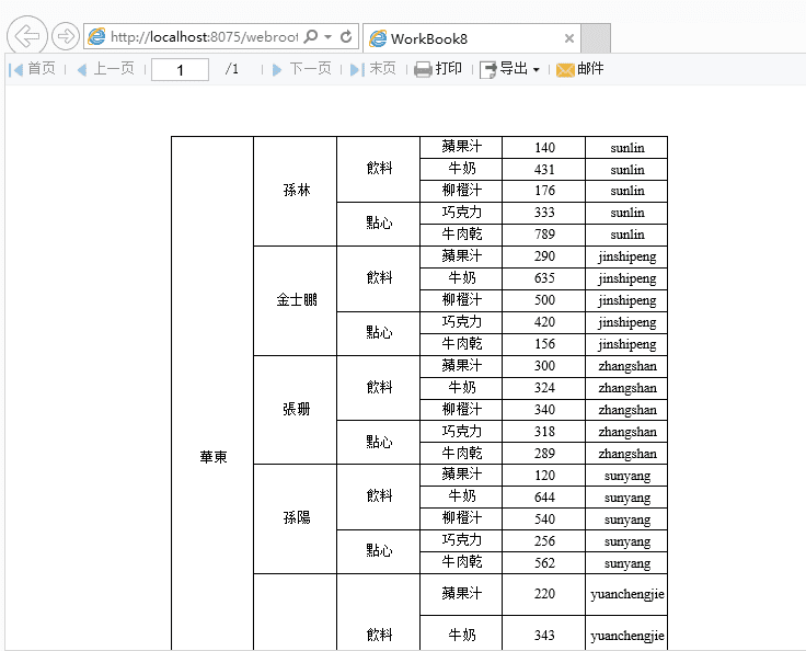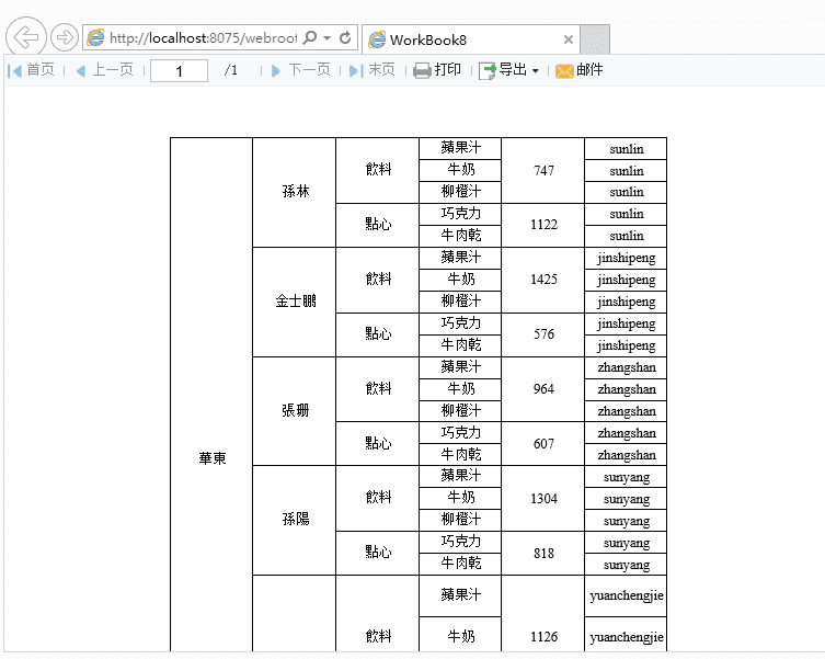 地區與銷售員為分組展示,右側產品分類的資料因為設定為列表,則會一列一列的展示出來。