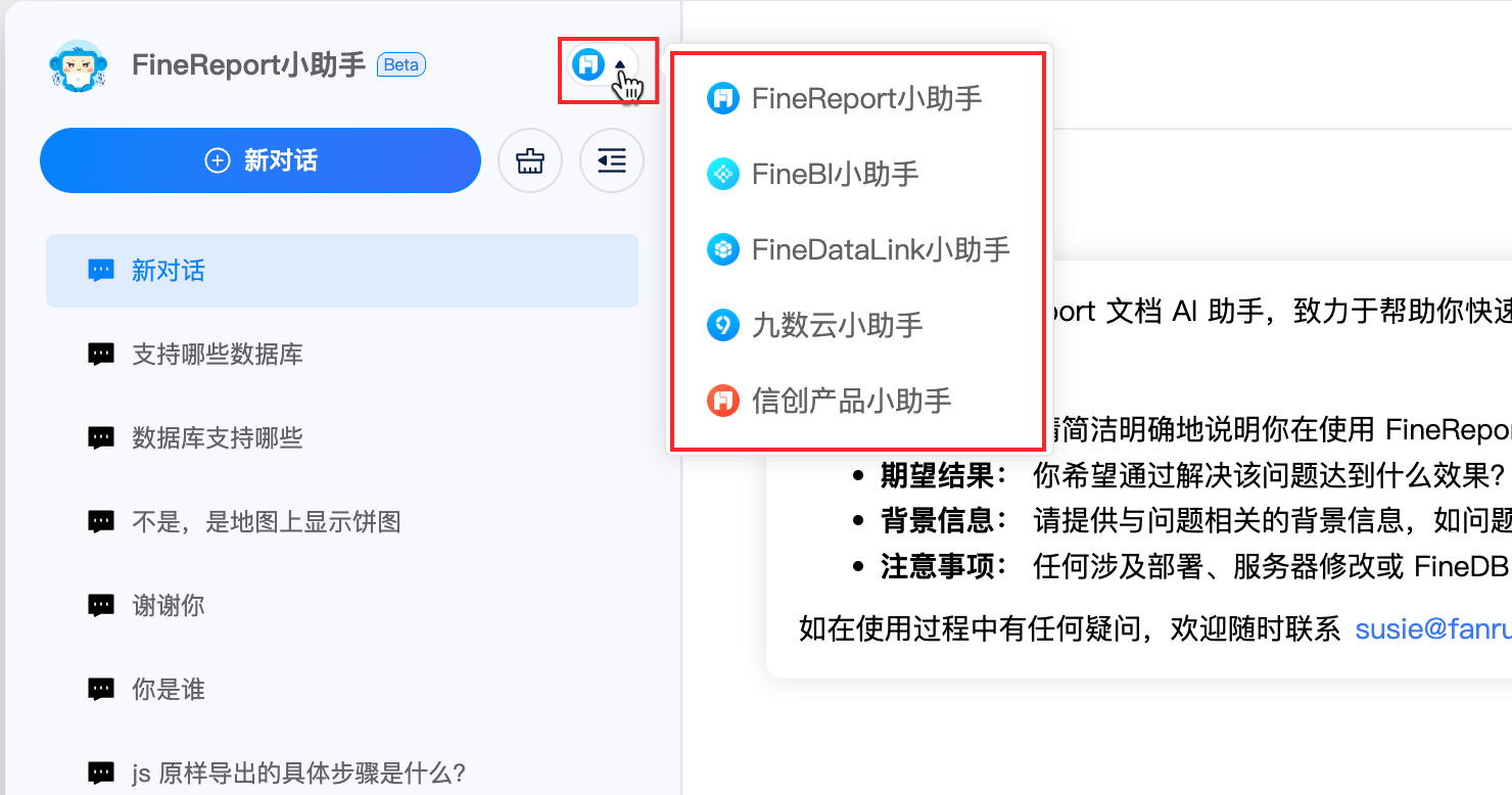 版本限制:目前小助手只基于最新版本的帮助文档进行训练,因此只能回答与帆软如 FineReport11、FineBI6.0 等最新版本相关的产品问题。