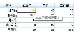 点击填报预览,在成本价下编辑数据,将第一行的成本价改成-1,第三行的成本价改成1000,点击左上角的数据校验,。由于我们填写的数据都超出了定义的范围,因此会出现错误的提示,如下图:
