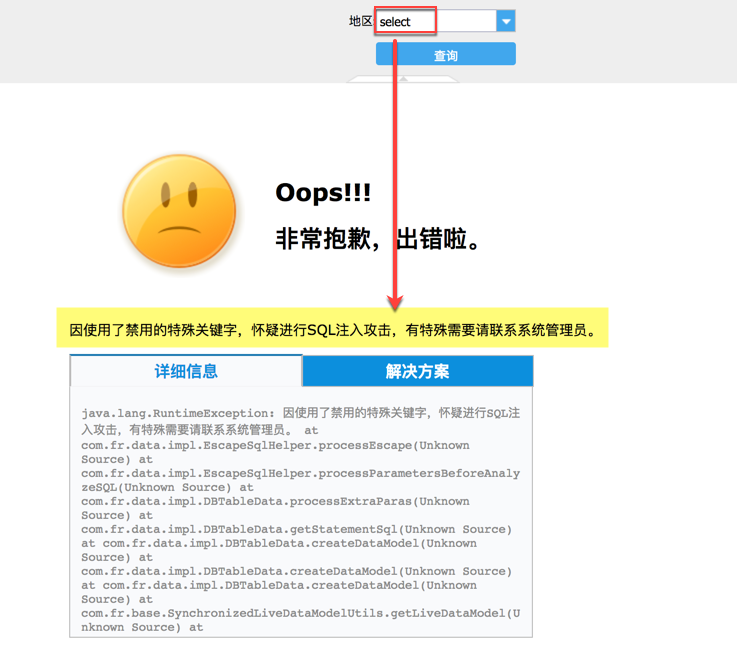打开模板%FR_HOME%\webroot\WEB-INF\reportlets\GettingStarted.cpt,在参数这里输入【select】,且当sql参数中存在需要禁用的字符——select,则在日志里抛出错误信息,”因使用了禁用的字符xxx,怀疑进行SQL注入攻击,有特殊需要请联系系统管理员“,如下图: