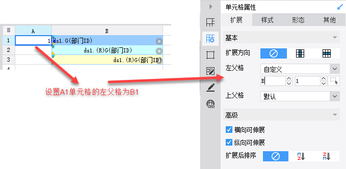 在需要展开的组织树节点前,增加 一个数字1作为定位符。并设置定位符的父格,随着部门进行扩展。