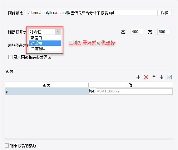 传递给子报表的参数名称,与子报表中的参数名称保持一致;传递给子报表的参数值,为分类名称(CATEGORY)即公司名称