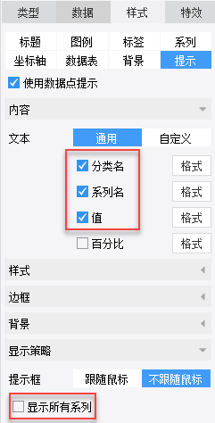 点击样式>提示>显示策略,默认不显示所有系列,即显示单系列的数据提示,如下图: