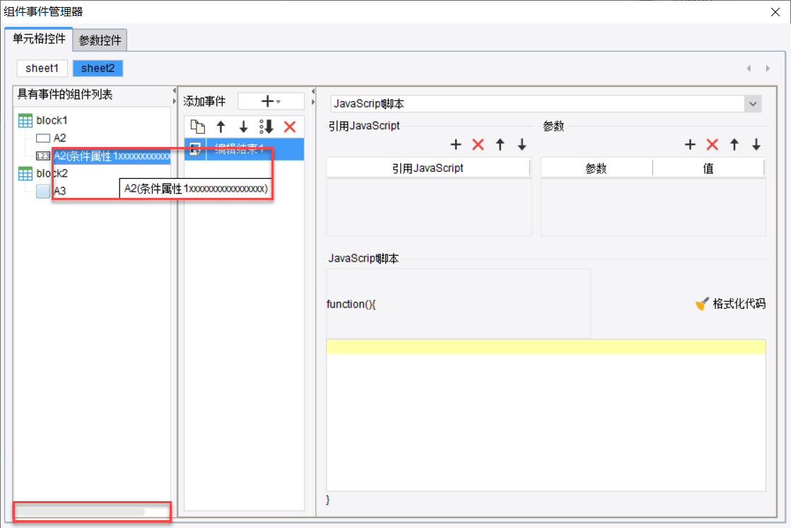 打开组件事件管理器,选择报表控件>sheet2,在Block1目录下,可以看到A2(条件属性1)出现在组件列表内,括号中为默认的条件属性名,前方的图标提示是为数字控件。