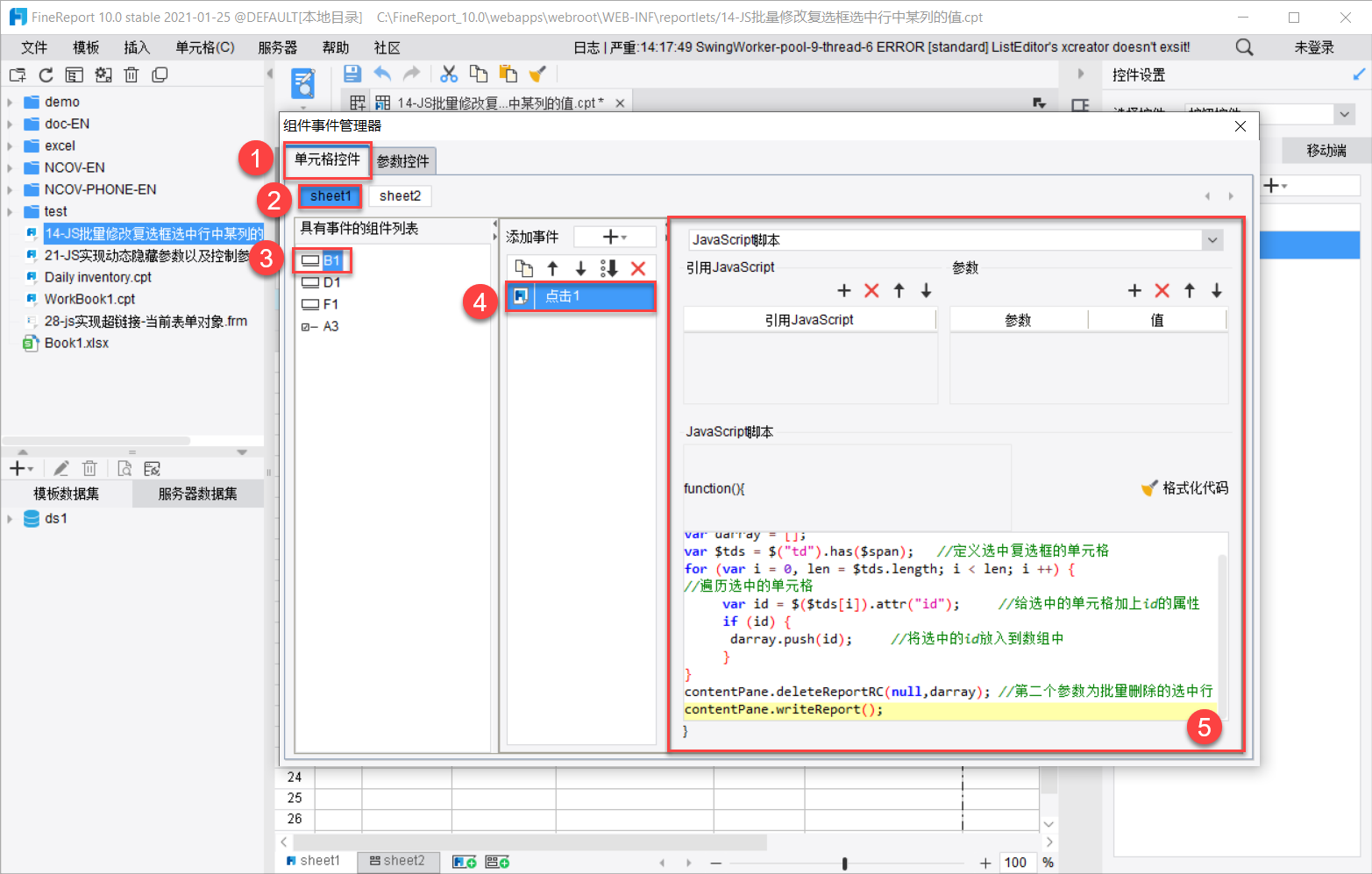 打开组件事件管理器,选择报表控件>sheet1,可以看到B1出现在组件列表内,前方的图标提示是为单元格按钮控件。