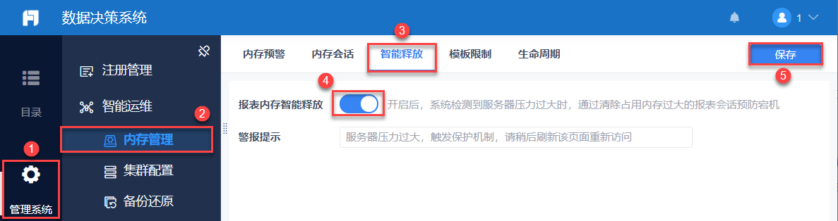 2)管理员可登录数据决策系统,点击「管理系统>智能运维>内存管理>智能释放」,关闭「报表内存智能释放」,点击「保存」即可,如下图所示: