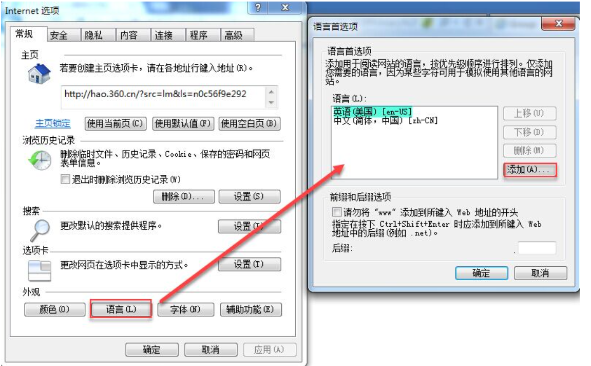 打开 IE 浏览器,点击工具栏上面的「工具>Internet 选项(0)」,在弹出对话框中选择「语言」,在弹出的「语言首选项」对话框中点击「添加」按钮,选择「英语(美国)[en-US]」点击确定,这时英语就添加到 IE 浏览器里面了,这时需要把「英语(美国)[en-US]」移动到最上面,即将浏览器默认语言设置为英语。如下图所示: