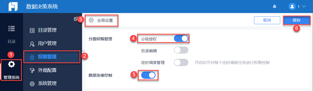 超级管理员登录数据决策系统,点击「管理系统>权限管理>全局设置」,开启「分级授权」按钮,开启「数据连接控制」按钮,点击「保存」。如下图所示: