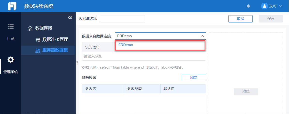 注2:FineReport 中,若用户有「数据连接」管理系统节点的查看权限,就能使用和编辑「服务器数据集」。
