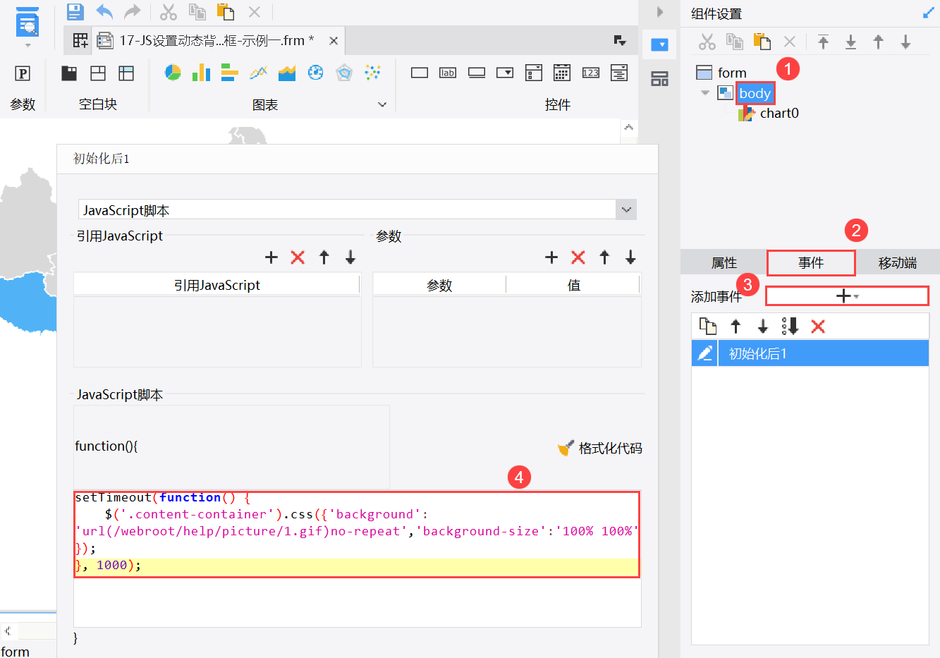 在控件列表中选择 body,为其添加一个「初始化后事件」。如下图所示: