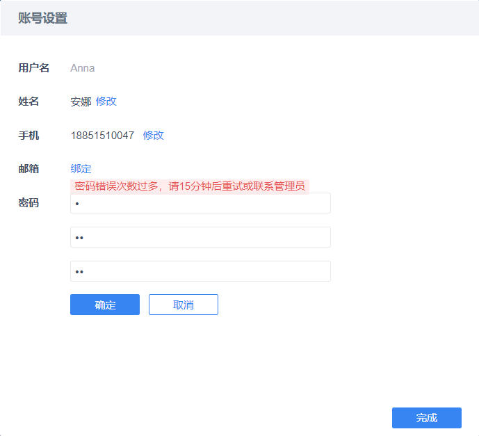 2)若 5 次机会使用完毕,仍然输入错误的旧密码,提示:密码错误次数过多,请15分钟后重试或联系管理员。