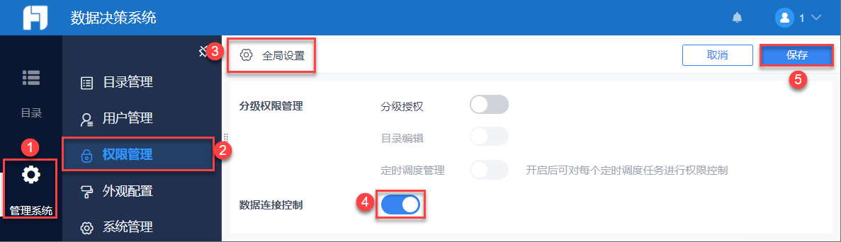 超级管理员登录数据决策系统,点击「管理系统>权限管理>全局设置」,开启「数据连接控制」按钮,点击「保存」。如下图所示: