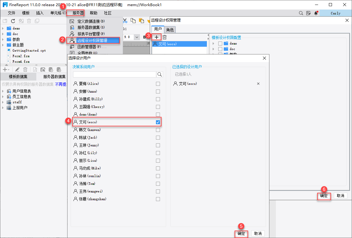 超级管理员远程连接工程,点击「服务器>远程设计权限管理」,将用户eoco添加到支持远程设计的名单中,如下图所示: