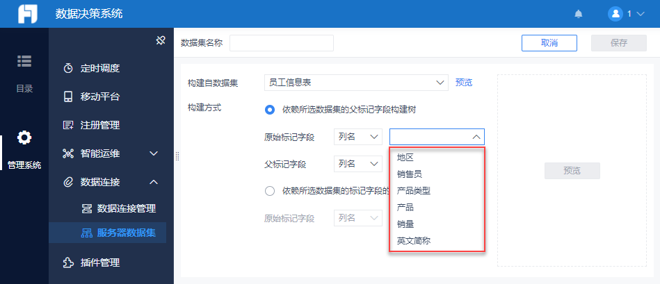 eoco 登录数据决策系统,点击「管理系统>数据连接>服务器数据集」,可编辑、预览、删除、重命名服务器数据集「员工信息表」。如下图所示: