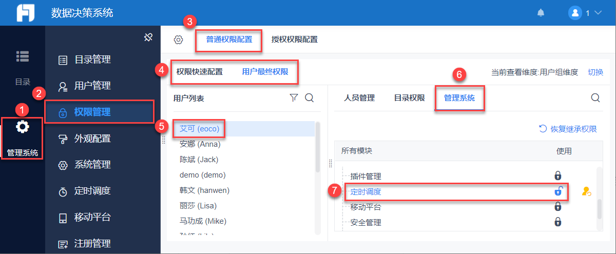管理员登录数据决策系统,点击「管理系统>权限管理>普通权限配置」,选择权限载体「部门/角色/用户」,本示例选择用户 eoco。