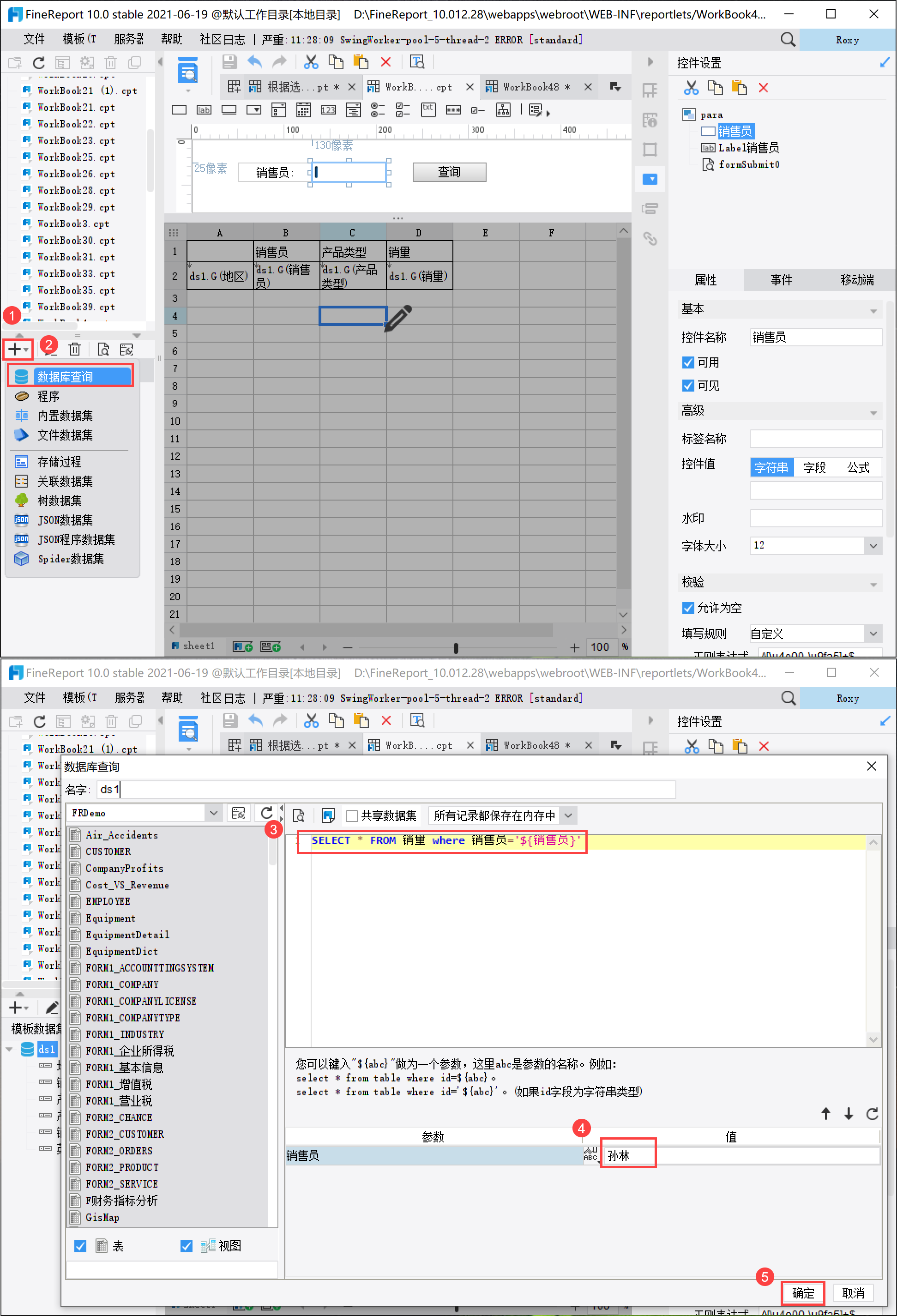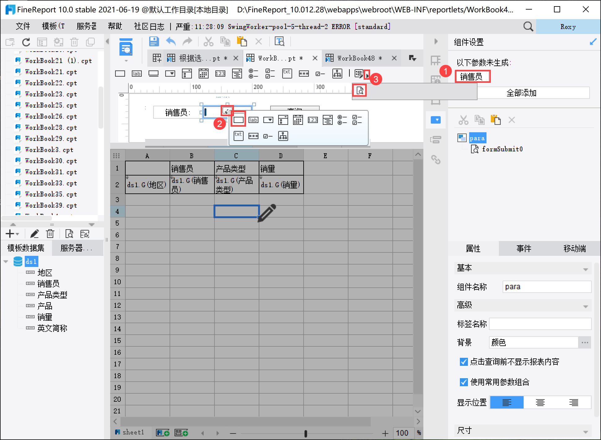 点击参数面板,将「销售员」参数添加并设置为文本控件,然后添加查询按钮,如下图所示:
