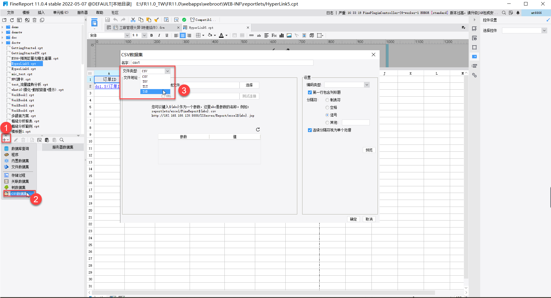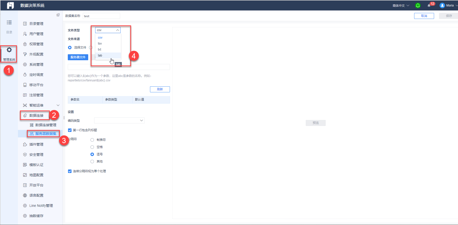 在数据决策系统中,建立CSV数据集,选择文件类型,可以看到支持刚才添加的TXT和TAB文件类型,如下图所示: