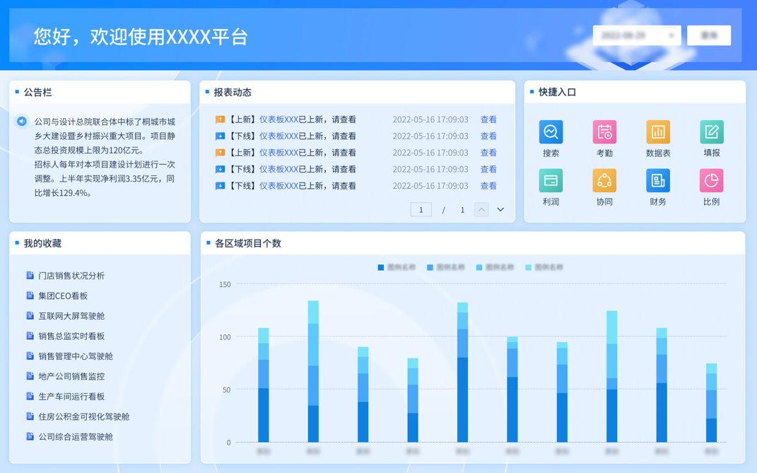 用户可以在门户首页中迅速找到自己收藏关注的报表、系统的公告、报表上下线动态等。