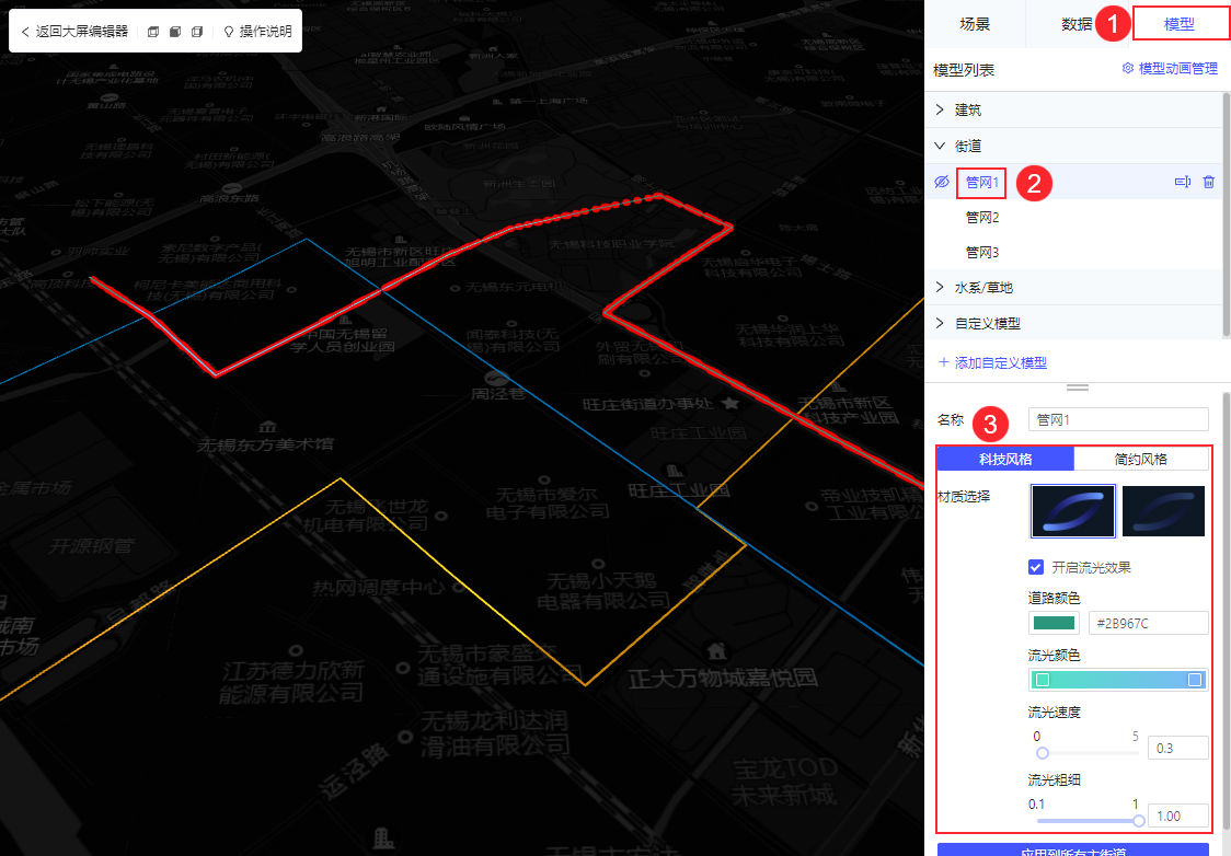 在「模型」中选中模型,修改自定义绘制的管网线路的样式,使其显示的更明显。如下图所示:
