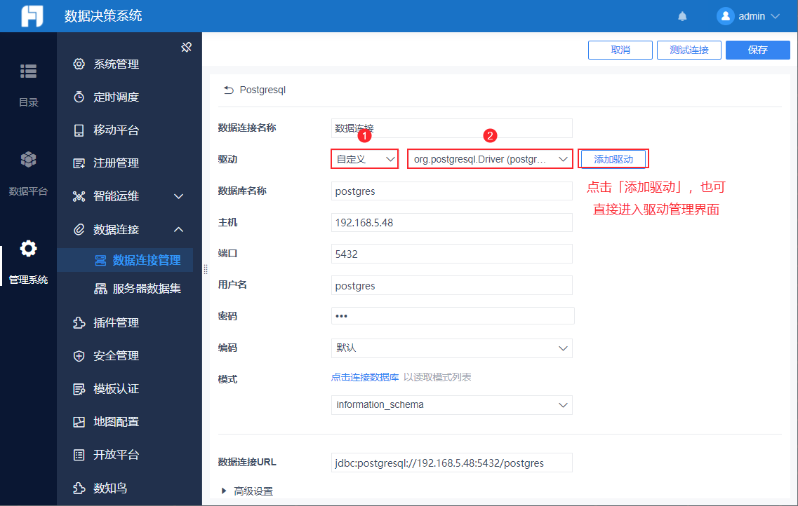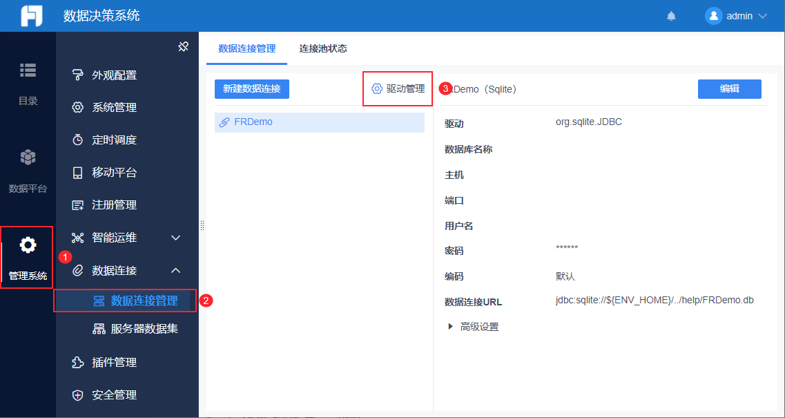 1)管理员登录数据决策系统,点击「管理系统>数据连接管理>驱动管理」,如下图所示: