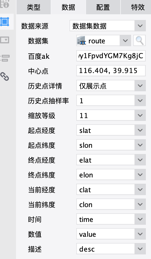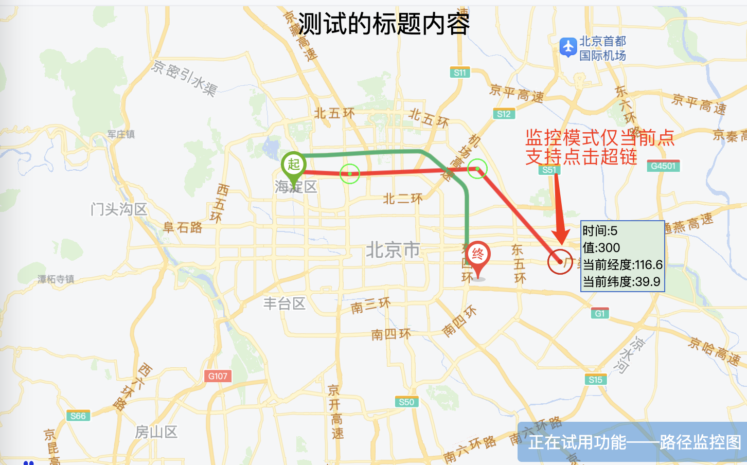 2.参考截图,数据格式为起点经纬度,终点经纬度,当前点经纬度(监控模式和路书模式需要当前点经纬度和时间),业务数据value,desc,time