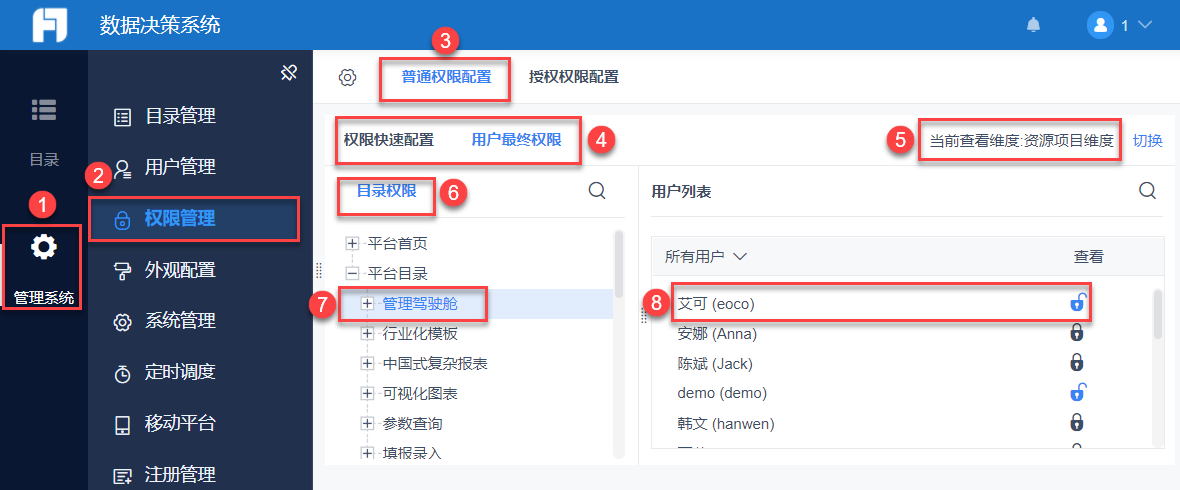 本章示例:在「资源项目维度」下,将目录「管理驾驶舱」的「查看」权限分配给用户「eoco」。