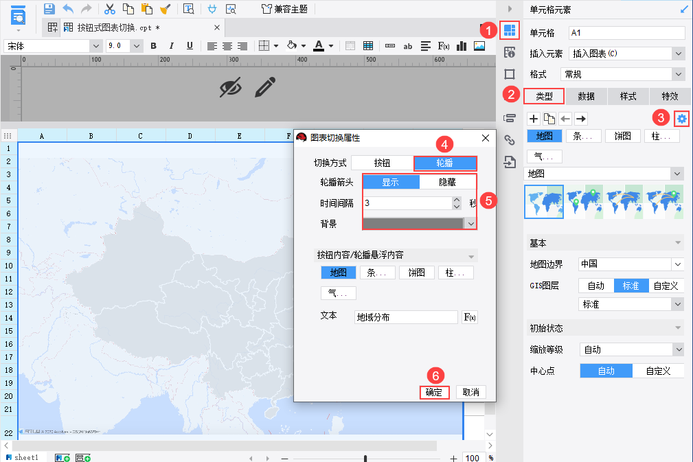 • 点击设置按钮 Snag_42c4a7b.png ,弹出图表切换属性设置框,可设置切换方式为「按钮」或「轮播」时的各种属性。