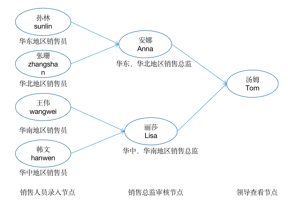 实现每个节点上仅绑定一个操作人员的上报 示例:销量上报流程中,销售员王伟上报,销售总监 Lisa 审核,领导 Tom 查看 | ![]() | |