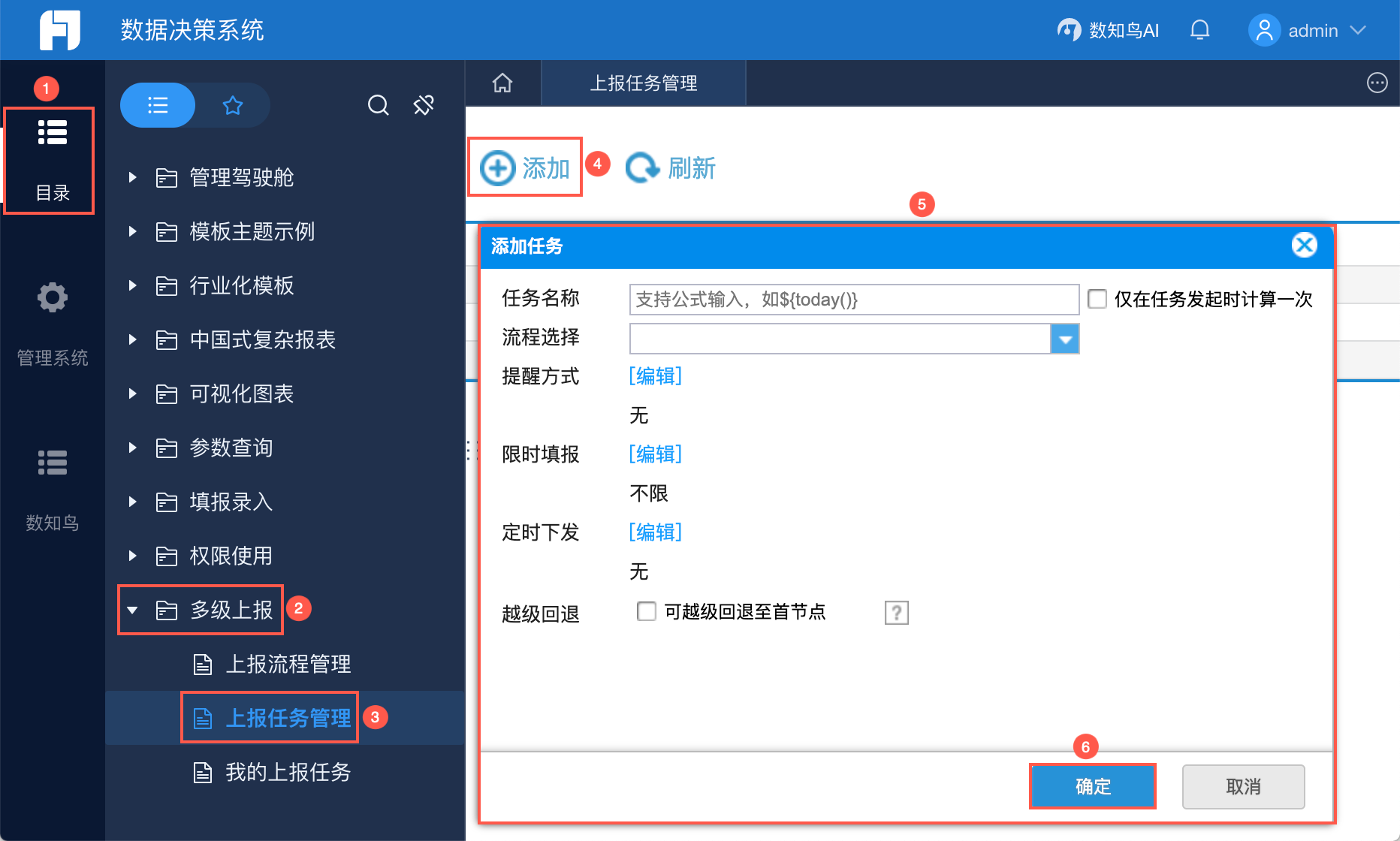 1)管理员可在上报标签内添加上报流程、设置上报任务用于数据的流转。