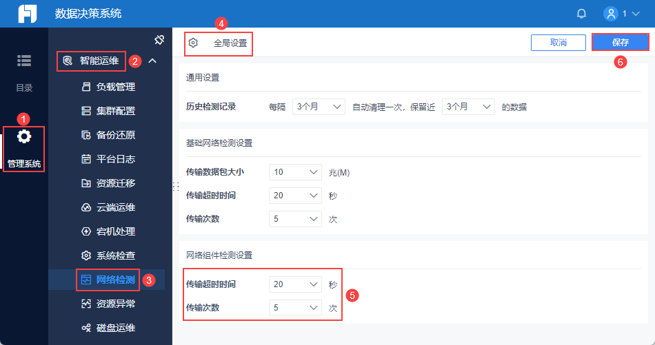 管理员登录数据决策系统,点击「管理系统>智能运维>网络检测>全局设置」,支持调整基础网络检测设置。如下图所示: