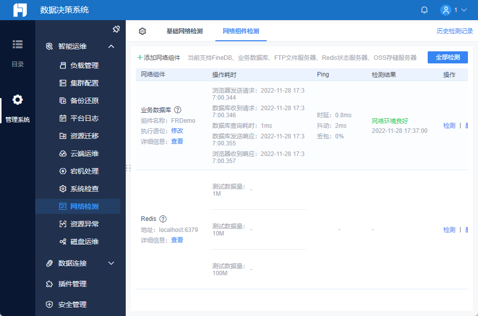 FineReport中内置了系统运维插件,帮助提供「网络检测」功能,当遇到性能问题时,可通过该工具一键检测是否存在网络问题。