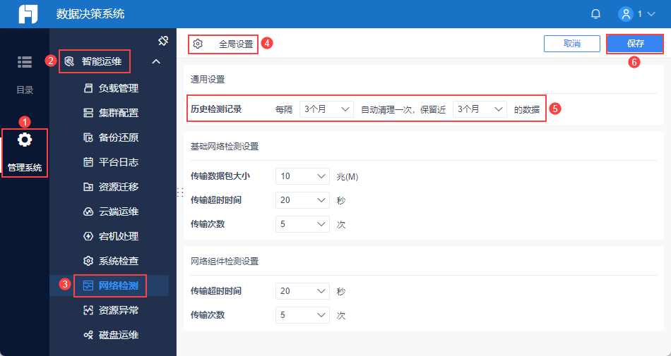 管理员登录数据决策系统,点击「管理系统>智能运维>网络检测>全局设置」,支持配置历史检测记录清理频率。如下图所示: