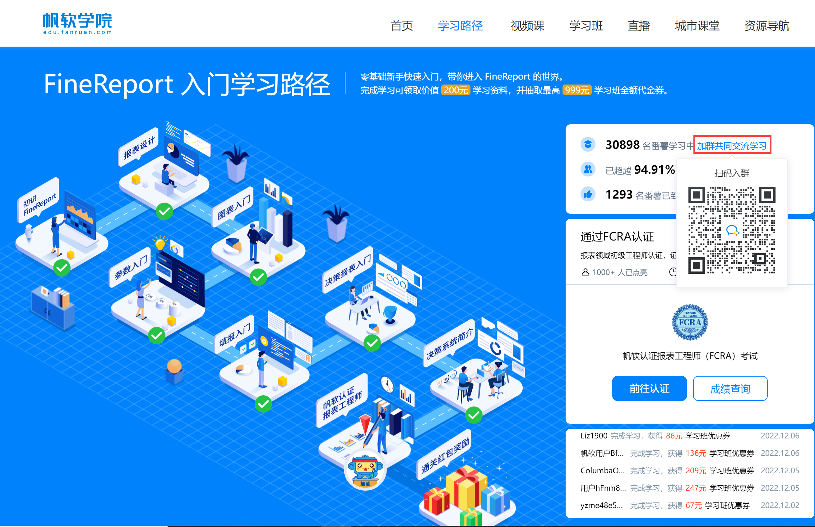 技术交流群是帆软为用户提供的交流学习群,在群中您可以与其他用户一起探讨问题。加入FineReport 微信交流群,前往 FineReport入门学习路径 - 帆软学院 (fanruan.com),点击「加群共同交流学习」即可扫码入群,如下图所示: