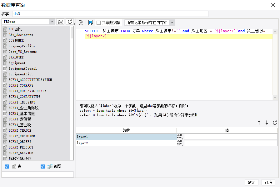 数据集 ds3,根据前两层 layer1、layer2 的值查询出城市,SQL 语句为:SELECT 货主城市 FROM 订单 where 货主城市!='' and 货主地区 = '${layer1}'and 货主省份='${layer2}'