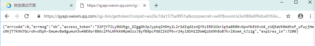 2)远程的报表环境所在服务器,在浏览器中(推荐使用Chrome)输入以下地址:https://qyapi.weixin.qq.com/cgi-bin/gettoken?corpid=微信应用ID&corpsecret=微信应用secret,返回如下图所示信息,代表服务器网络正常,可以获取微信 token 值,排除服务器网络原因。