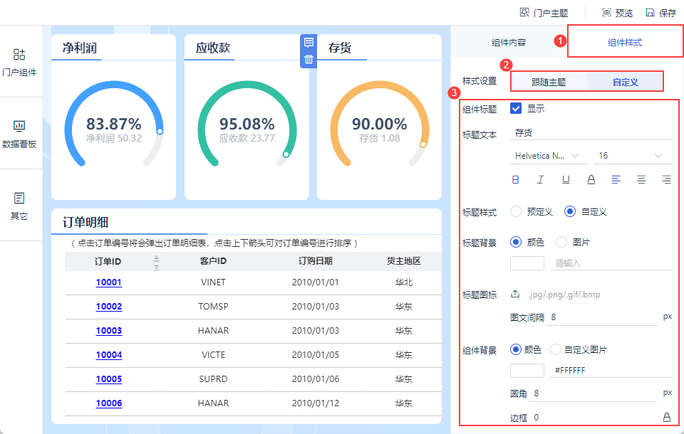 2)自定义:组件样式不跟随「门户主题」的切换而变化。组件样式包括组件标题、标题文本、标题样式、组件背景。