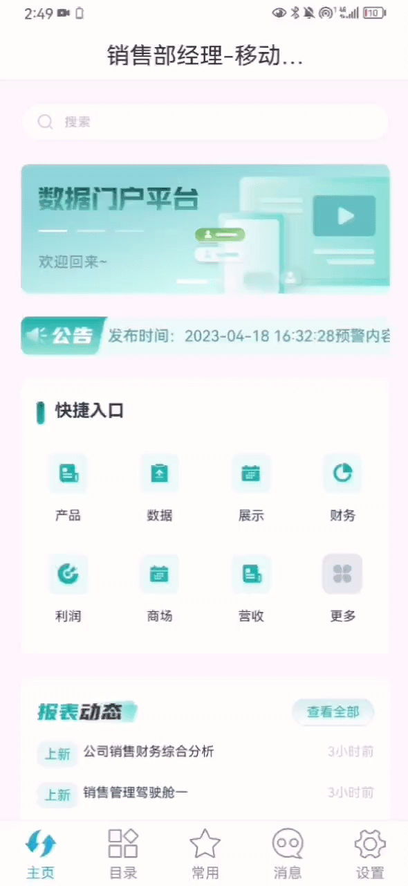 预览移动端数据门户时,公告栏组件将横向滚动播放最新的公告内容,单击后弹窗打开查看完整公告。