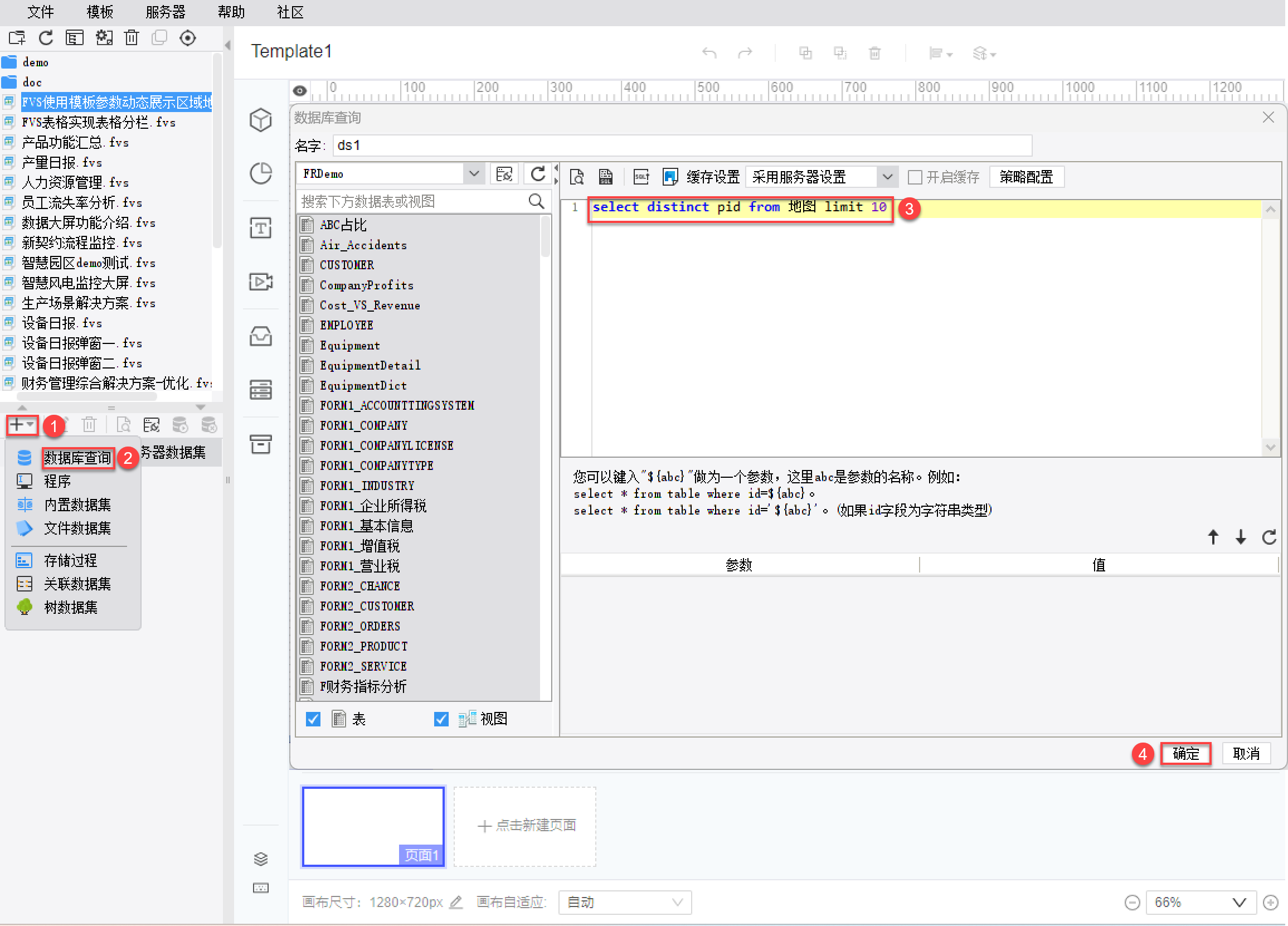 1)新建数据集 ds1,数据库查询语句为:select distinct pid from 地图 limit 10。