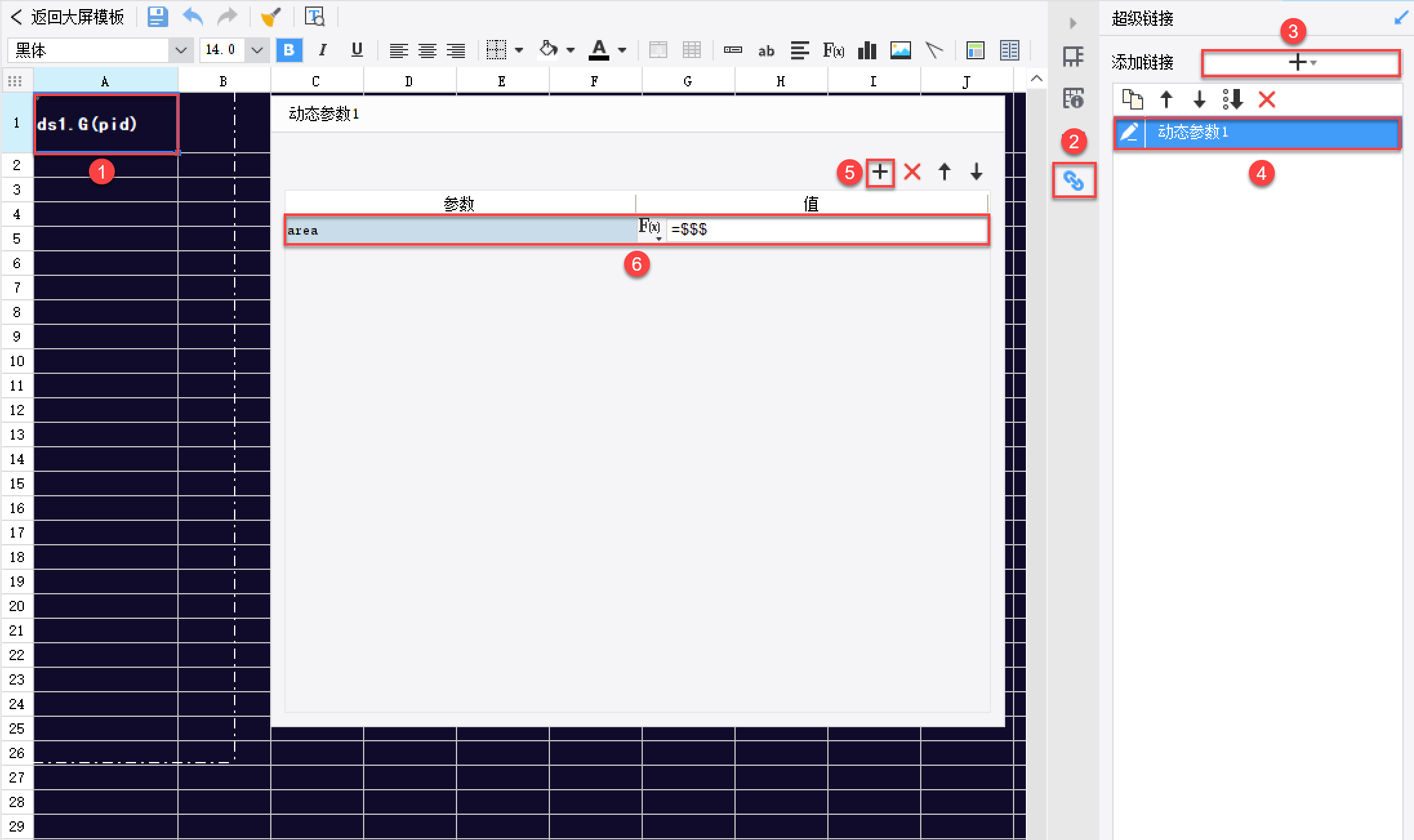 2)编辑表格,给 A1 单元格添加动态参数类型的超级链接,设置参数为area,值为公式$$$。